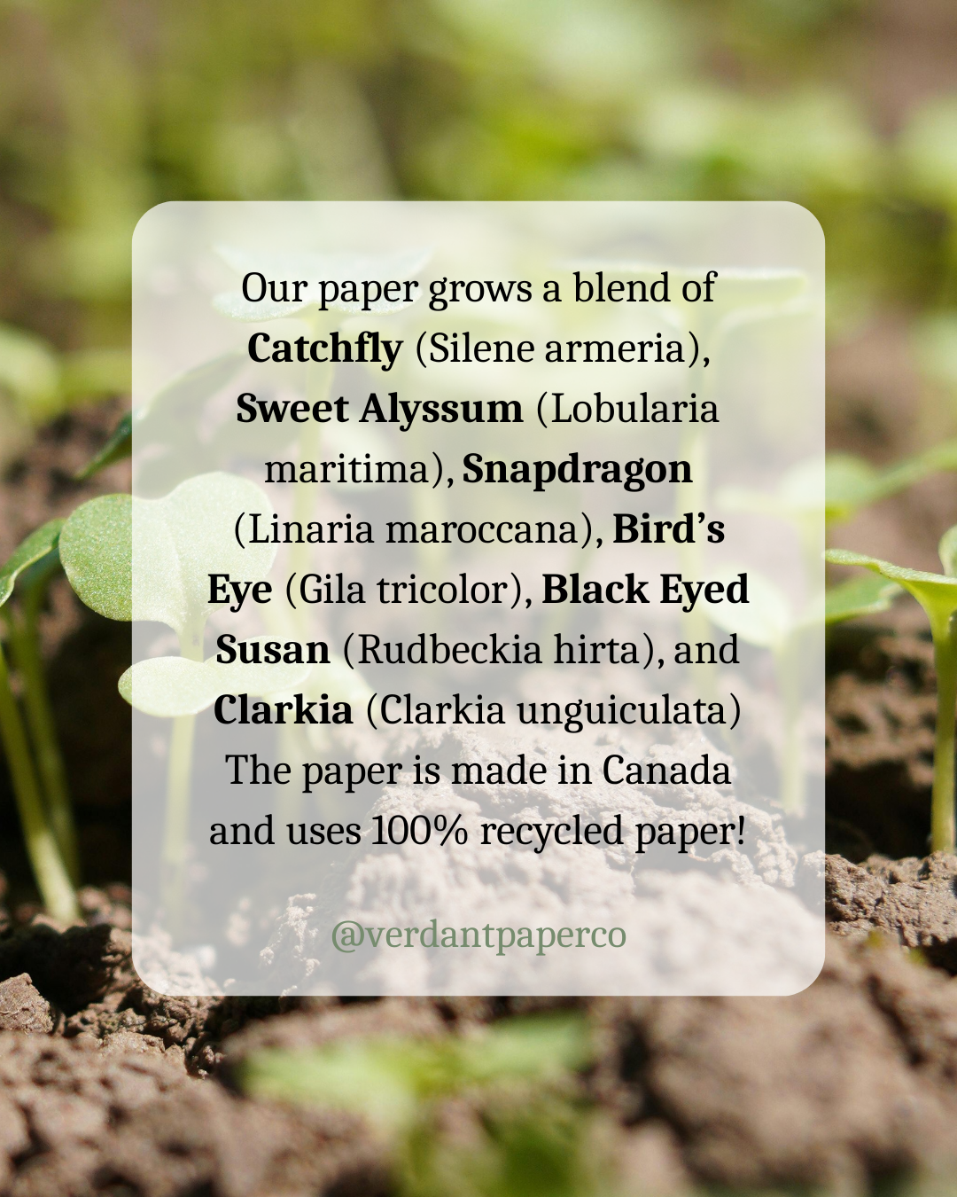 Plantable wildflower seed paper –This biodegradable card can be planted to grow flowers! Our paper is embedded with a mix of the following seeds: Black Eyed Susan, Bird's Eye, Snapdragon, Sweet Alyssum, Clarkia, and Catchfly and made in Canada!